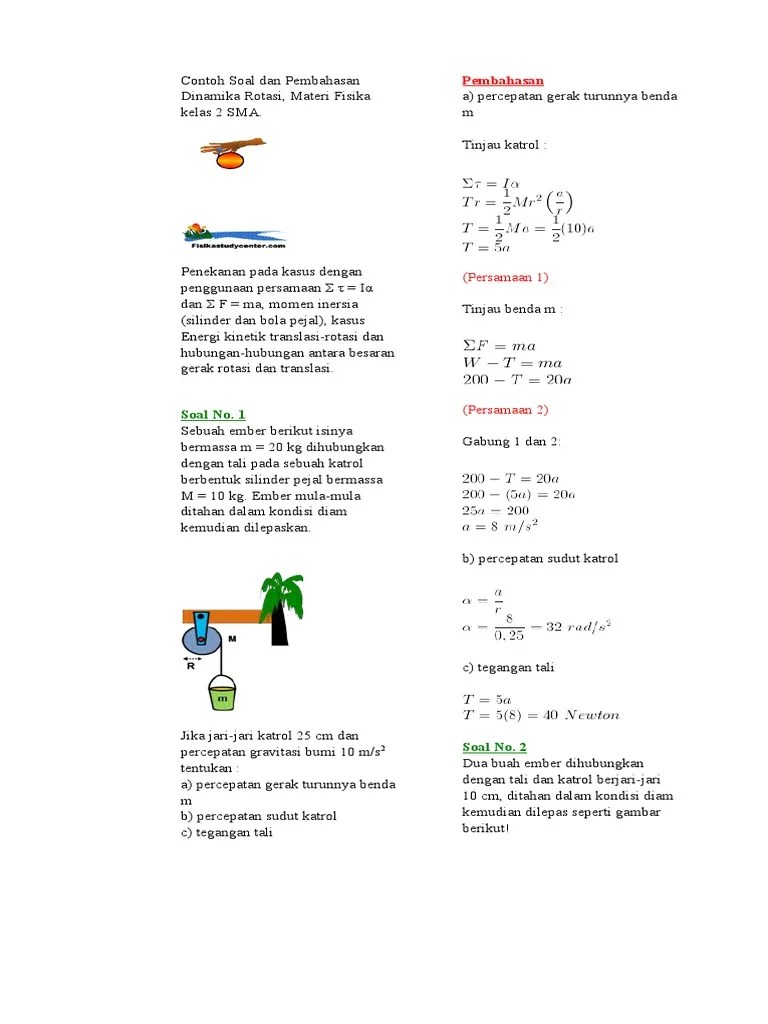 soal ulangan harian transformasi (refleksi, translasi, rotasi, dilatasi) matematika sma kelas xi dan pembahasannya ini merupakan file soal terbaru yang akan kami bagikan. Kirimkan ini lewat email blogthis. December 12, 2016, admin, no comment. Contoh soal dinamika rotasi dan pembahasannya. Seorang anak sedang menggambar sebuah peta pulau sumatra. Jika anda masih baru dalam bab ini maka anda perlu membaca rangkuman kesetimbangan benda tegar. Sebuah ember berikut isinya bermassa m = 20 kg dihubungkan dengan tali pada sebuah katrol berbentuk silinder pejal bermassa m = 10 kg. 10 soal ipa kelas 9 tentang pewarisan sifat beserta jawabannya 23 desember 2018 tags: Contoh soal dan pembahasan tentang dinamika gerak materi fisika kelas 2 xi sma dengan melibatkan gaya gesek dalam beberapa kasus dinamika variasi menentukan nilai gaya normal gaya kontak dan. Sebuah benda yang massanya 20 kg digantungkan pada ujung tali seperti pada gambar. Materi fisika kelas xi jumat, 03 juni 2011. Salah satu materi fisika kelas 11 adalah tentang dinamika rotasi banyak siswa yang merasa kesulitan untuk mengerjakan soal tentang dinamika rotasi ini terutama terkait dengan hubungan torsi dengan gerak menggelinding menentukan momen inersia atau energi kinetik benda saat. Contoh soal rotasi smp kelas 9.